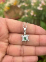Bring nature’s elegance to life with the 925 Silver Emerald Turtle Necklace from Artist Jewels Boutique. This unique necklace features a 100% natural genuine emerald set within a beautifully crafted turtle pendant. The emerald, measuring 5x3mm, radiates a vibrant green color, symbolizing renewal, growth, and harmony.