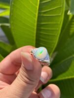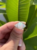 Surrounding the opal are shimmering simulated diamonds (CZ), carefully placed to enhance the opal’s natural beauty and add a touch of sparkle. The white CZ stones delicately frame the opal, creating a harmonious and elegant design that is sure to turn heads.